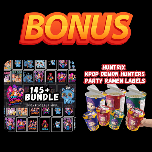 Shop K-Pop Demon Hunters digital downloads including Huntrix SVG & PNG cut files, printable ramen label templates, and editable Canva birthday invitations.