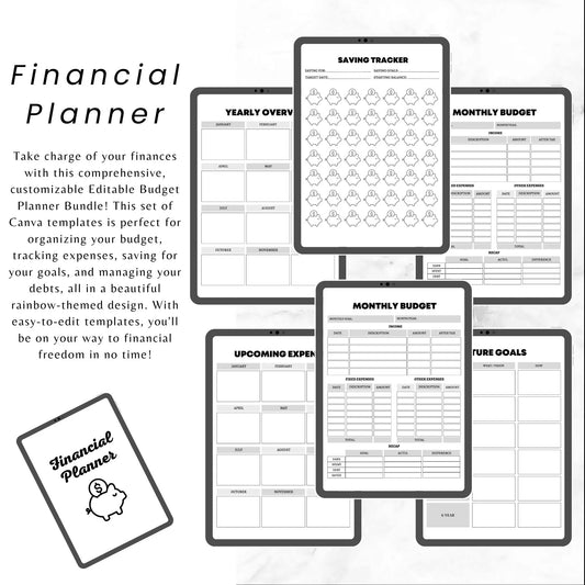 Editable Budget Planner Bundle / Monthly Tracker / Debt & Savings Tracker / 12-Week Challenge / Rainbow Financial Planner Canva Templates