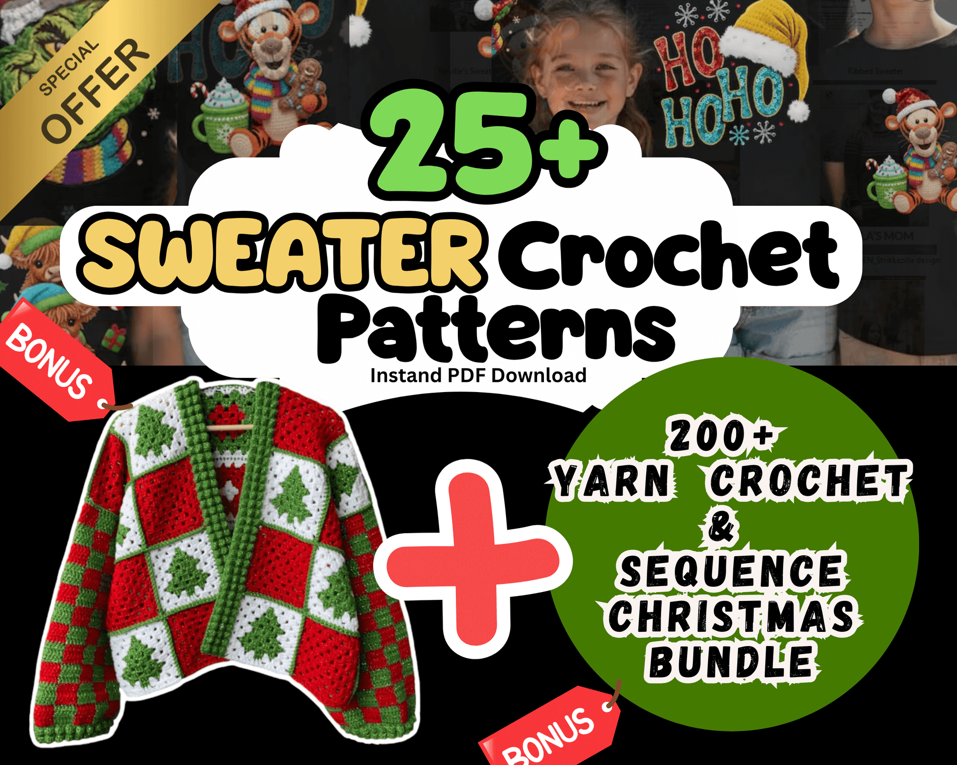 🎁 Bonus: Includes a festive Ugly Christmas Cardigan Sweater Pattern and the 200+ Yarn Crochet & Christmas Sequence Bundle for holiday creativity!