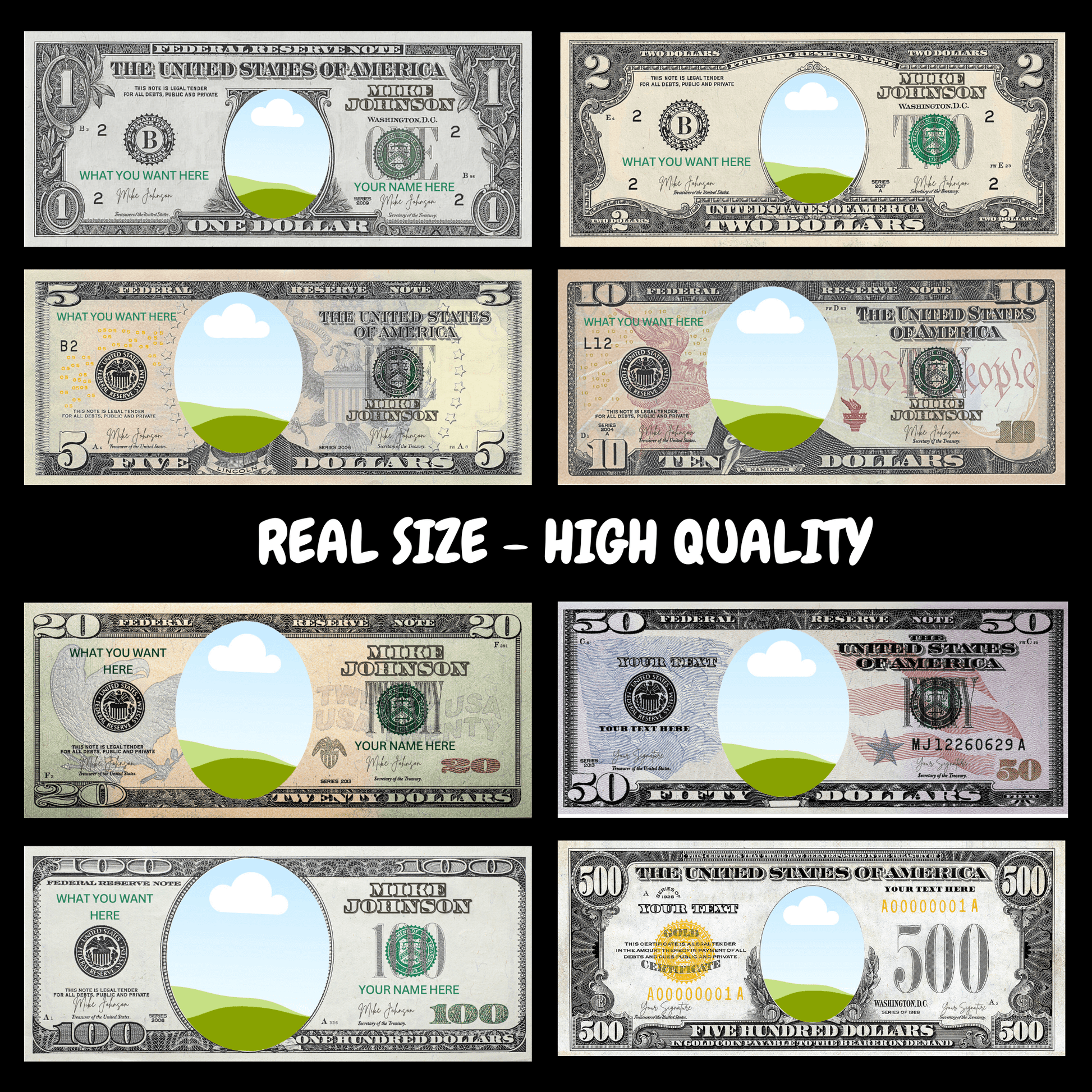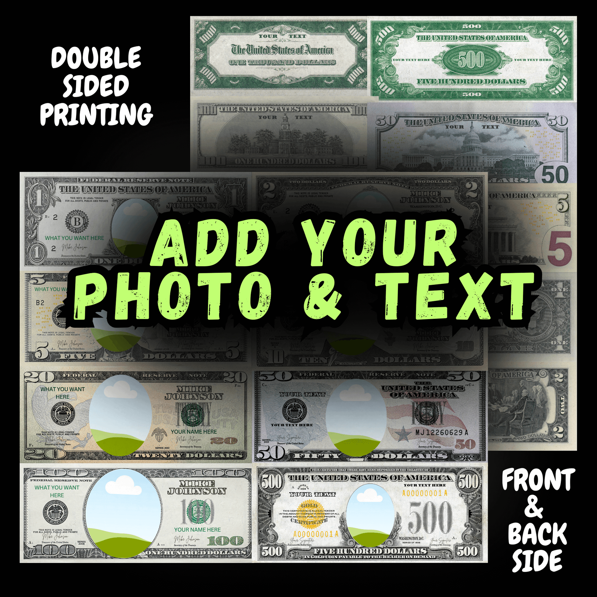 Custom Dollar Bill Template Bundle – 1, 2, 5, 10, 20, 50, 100, 500, 1000 – Editable Face on Money – Canva Printable Download